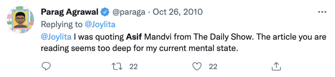 However, those criticizing Twitter’s new CEO – as of just a few hours ago – don’t seem to realize Agrawal is quoting an episode of The Daily Show with Jon Stewart that aired that very night in 2010.